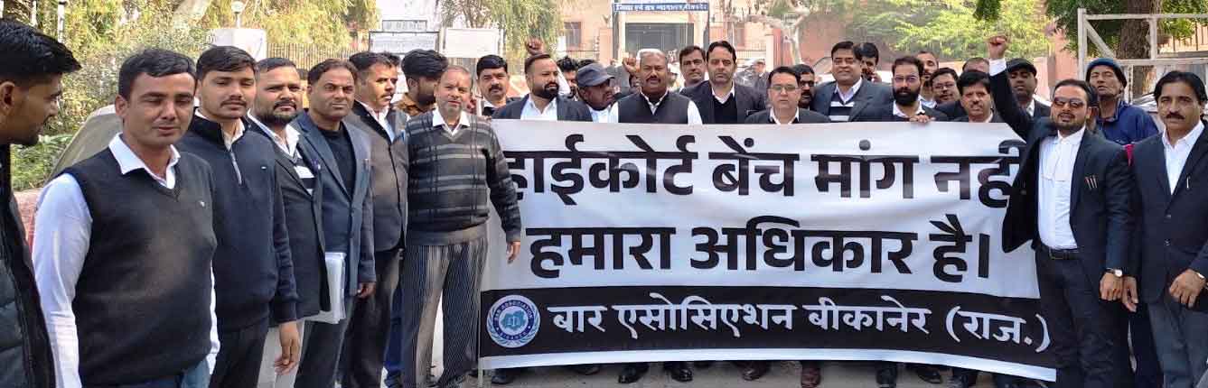 बीकानेर। बार एसोसिएशन, बीकानेर द्वारा बीकानेर संभाग मुख्यालय पर राजस्थान उच्च न्यायालय की बेंच की स्थापना की मांग को लेकर प्रोटेस्ट-डे मनाया गया। उपाध्यक्ष धर्मेन्द्र वर्मा के नेतृत्व में अधिवक्ताओं ने बीकानेर कलेक्टर को राज्यपाल महोदय के नाम 193वां ज्ञापन सौंपा। इस अवसर पर अधिवक्ताओं ने हाईकोर्ट बेंच स्थापना की मांग को दोहराते हुए इसे क्षेत्र की न्यायिक आवश्यकता बताया। ज्ञापन सौंपने के दौरान बीसीआईओ सदस्य कुलदीप शर्मा, उपाध्यक्ष लेखराम धारावत, मनीष गोड़, सचिव हेमसिंह चौहान, संयुक्त सचिव मुकेश कृष्णा, गणेश टांक, पूर्व बार अध्यक्ष रघुवीर सिंह राठौड़, हनुमान विश्नोई, नवीन व्यास, मंगलराम विश्नोई, प्रेम विश्नोई, सुखदेव व्यास, रामनिवास विश्नोई, ताराचंद उपाध्याय, नसीर हबीब, राजेश देवड़ा, विजयपाल चौधरी, कुलदीप कटेला, मनीष सांखला सहित अनेक अधिवक्तागण उपस्थित रहे।
