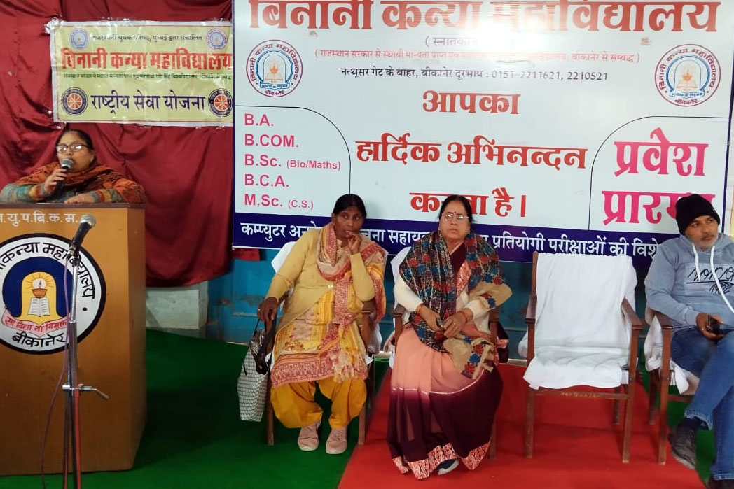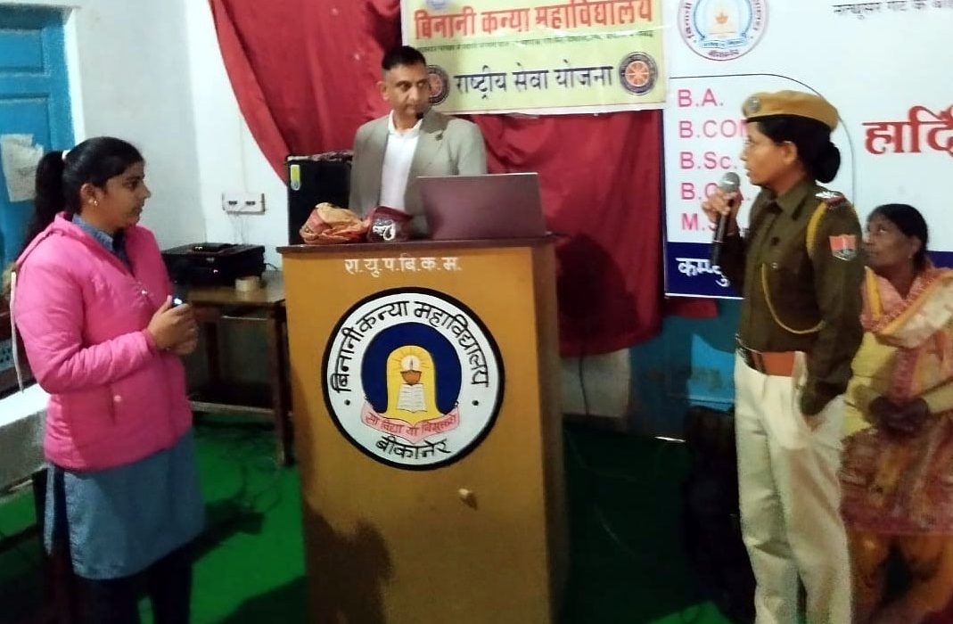 बीकानेर। बिनानी कन्या महाविद्यालय में राष्ट्रीय सेवा योजना के विशेष शिविर के आज दूसरे दिन श्रमदान, स्वच्छता तथा साइबर क्राइम पर परिचर्चा का आयोजन किया गया । कार्यक्रम के प्रथम चरण में राष्ट्रीय सेवा योजना की प्रथम इकाई की प्रभारी डॉ अनीता मोहे भारद्वाज से बताया कि कार्यक्रम में आज द्वितीय दिवस के प्रथम चरण