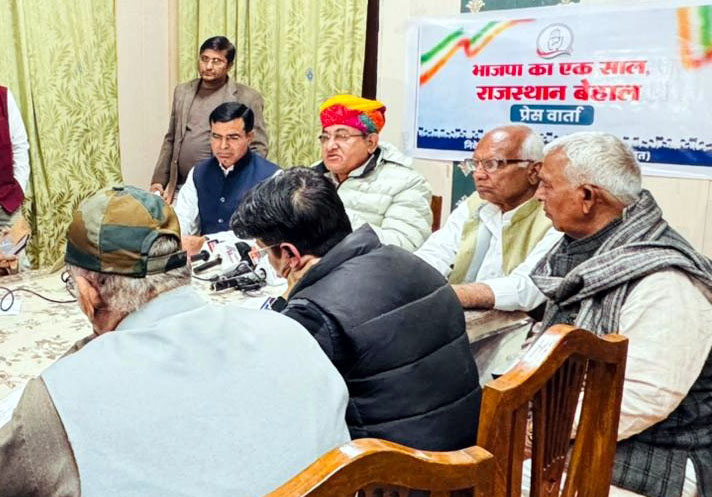 भाजपा सरकार में बिगड़ी कानूनी व्यवस्था : मेघवाल बीकानेर। बीकानेर के सर्किट हॉउस में भाजपा सरकार के एक वर्ष पूर्ण होने पर देहात कांग्रेस कमेटी की ओर से एक प्रेसवार्ता का आयोजन किया गया। पूर्व केबिनेट मंत्री गोविन्दराम मेघवाल व जिलाध्यक्ष बिशनाराम सियाग ने सरकार के एक साल के कार्यकाल को पूरी तरीके से फ्लॉप