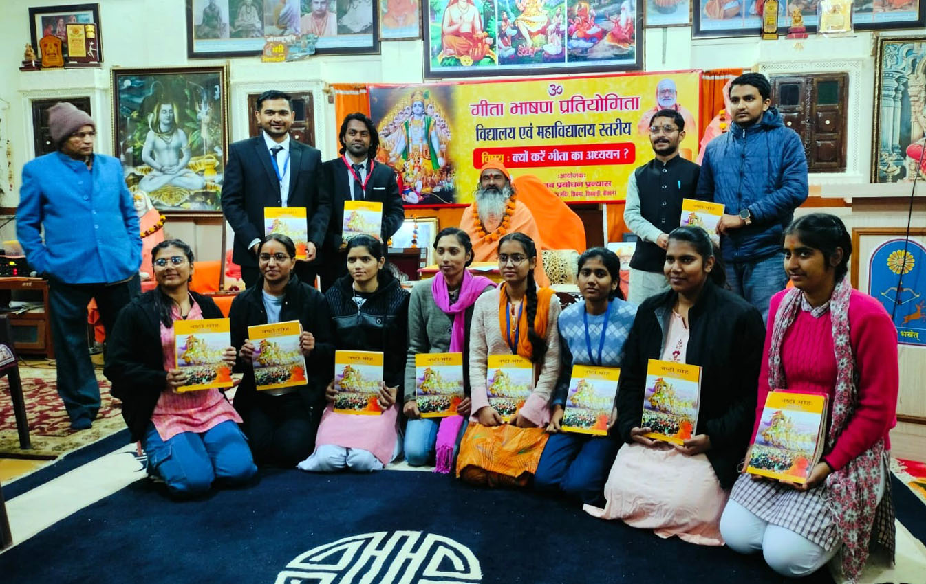बीकानेर। परम पूज्य ब्रह्मलीन स्वामी संवित् सोमगिरिजी महाराज की प्रेरणा, आशीर्वाद एवं अनुकम्पा से श्रीलालेश्वर महादेव मन्दिर, शिवमठ, शिवबाड़ी, बीकानेर के अधिष्ठाता पूज्य स्वामी श्रीविमर्शानन्दगिरिजी महाराज के सान्निध्य में महाविद्यालय स्तरीय गीता भाषण प्रतियोगिता संपन्न हो गई। इस भाषण प्रतियोगिता का विषय- ’’क्यों करे गीता का अध्ययन’’ रखा गया। जिसमें प्रथम स्थान राजकीय विधि महाविद्यालय बीकानेर के छात्र ऋषि कुमार शर्मा, द्वितीय स्थान श्री भीमसेन चौधरी राजकीय महाविद्यालय की छात्रा गरिमा तथा तृतीय स्थान पर श्री भीमसेन चौधरी राजकीय महाविद्यालय की छात्रा पलक गौड़ रहें। प्रोत्साहन पुरस्कार मां करणी बीएड कॉलेज, नाल की प्रियंका कुमारी, पालडीवाला एजुकेशल एण्ड ट्रैनिंग सोसायटी लक्ष्मणगढ़ (सीकर) के सुनील कुमार, राजकीय डूंगर महाविद्यालय की इशिता पाठक व मुरली सिंह यादव मेमोरियल प्रशिक्षण संस्थान, उदयरामसर की गीतांजलि को प्रदान किया जाएगा तथा महाविद्यालय स्तरीय डॉ छगन मोहता स्मृत्ति चल वैजयन्ती भीमसेन चौधरी राजकीय महाविद्यालय को प्रदान की जाएगी। इस गीता भाषण प्रतियोगिता में निर्णायक मंडल में डॉ शशि गुप्ता,, हरनारायण खत्री, हरीशचंद्र शर्मा, कन्हेयालाल पंवार, हरिओम पूंज, रमेश शर्मा, आचार्य शैलेश तिवारी, राजकुमार कौशिक, बेला दाधीच, बजरंगलाल शर्मा, डॉ. विनोद चौधरी, मंजूलता शर्मा, सुशीला व्यास, ज्योति थे। मानव प्रबोधन प्रन्यास के विजेन्द्र सिंह भाटी के अनुसार 25 दिसंबर, बुधवार को सायं 4ः00 बजे समारोह में गीता-ज्ञान-परीक्षा, विद्यालय एवं महाविद्यालय वर्ग के भाषण व निबन्ध प्रतियोगिता के विजेता प्रतिभागियों को नकद पुरस्कार, स्मृत्ति चिह्न, प्रमाण-पत्र व गीता-श्लोक-स्मरण परीक्षा में विजेता विद्यालयों, महाविद्यालयों को सम्मानित किया जायेगा। इस समारोह के विशिष्ट अतिथि सुश्री सिद्धि कुमारी, विधायक (बीकानेर पूर्व), श्री जेठानंद व्यास, विधायक (बीकानेर पश्चिम), श्रीमती नम्रता वृष्णि, जिला कलेक्टर तथा मनोज दीक्षित, कुलपति, महाराज गंगा सिंह विश्वविद्यालय एवं राजूवास, बीकानेर होंगे।