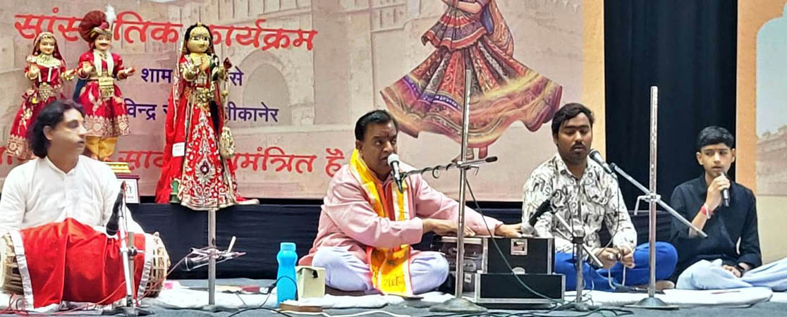 बीकानेर। राजस्थान दिवस के अवसर पर आयोजित कार्यक्रमों की श्रृंखला में गुरुवार को जिला प्रशासन एवं पर्यटन विभाग के संयुक्त तत्वावधान में सांस्कृतिक संध्या का आयोजन हुआ। कार्यक्रम का शुभारम्भ चिकित्सा एवं स्वास्थ्य मंत्री श्री गजेंद्र सिंह खींवसर, बीकानेर पूर्व विधानसभा क्षेत्र विधायक सुश्री सिद्धि कुमारी और जिला कलेक्टर श्रीमती नम्रता वृष्णि ने दीप प्रज्वलन के साथ किया। कार्यक्रम की शुरुआत नारायण रंगा एवं दल ने हवेली संगीत के साथ किया। गिरीश एवं दल गणगौर गायन के माध्यम से पारंपरिक संस्कृति की झलक प्रस्तुत की। इस दौरान वंदेमातरम का सामूहिक गायन किया गया। कार्यक्रम में बीकानेर विकास विकास प्राधिकरण आयुक्त श्रीमती अपर्णा गुप्ता, श्याम पंचारिया, मेडिकल कॉलेज प्राचार्य डॉ सुरेंद्र वर्मा, नगर निगम उपायुक्त ऋषि सुधांशु पांडे, पर्यटन विभाग के संयुक्त निदेशक अनिल राठौड़, सहायक निदेशक महेश व्यास, महिला एवं बाल विकास विभाग के उपनिदेशक सुभाष बिश्नोई, पर्यटन अधिकारी हिमांशु राय, नेहा शेखावत सहित विभिन्न गणमान्य नागरिक मौजूद रहे।
