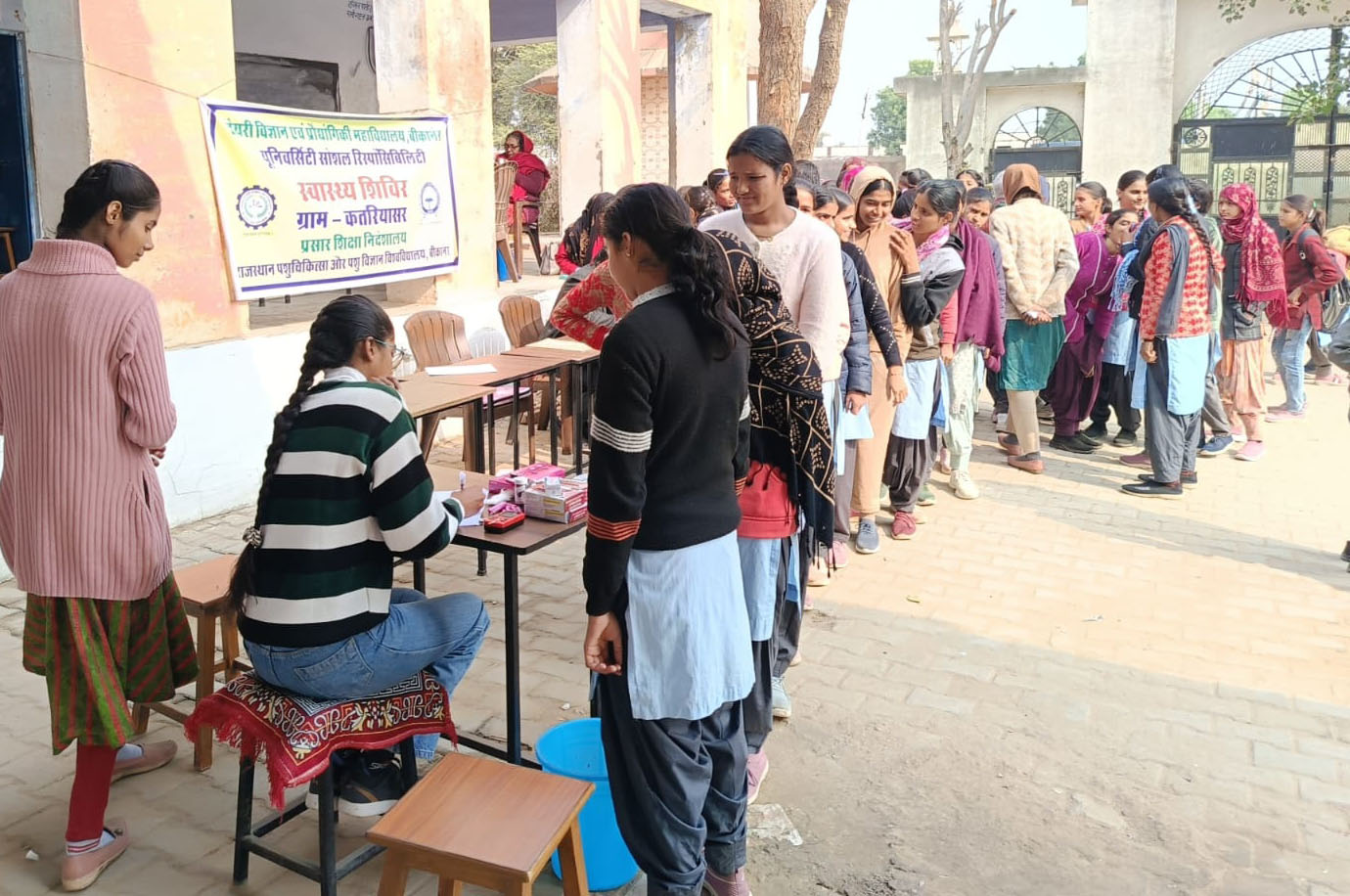 बीकानेर। यूनिवर्सिटी-सोशल रिस्पांसिबिलिटी के तहत डेयरी विज्ञान एवं प्रौद्योगिकी महाविद्यालय, बीकानेर द्वारा गोद लिए गांव कतरियासर में मंगलवार को प्रभारी आयुष्मान आरोग्य मंदिर (कतरियासर) डॉ. प्रेमाराम के निर्देशन में शिविर का आयोजन राजकीय बालिका उच्च माध्यमिक विद्यालय में किया गया। शिविर के दौरान 126 छात्राओं का स्वास्थ्य जांच कर मौसमी बीमारियों से बचाव हेतु सुझाव दिए गए आवश्यकता अनुसार दवाइयों का वितरण भी किया गया। प्रभारी आयुष्मान आरोग्य मंदिर (कतरियासर) डॉ. प्रेमाराम ने छात्राओं को रक्त की कमी, कुपोषण से होने वाली बीमारियों इत्यादि के बचाव एवं उपचार के बारे में जागरूक किया। चिकित्सा शिविर का प्रबंधन डॉ. सुनील कुमार, सहायक आचार्य डेयरी विज्ञान एवं प्रोद्योगिकी महाविद्यालय, बीकानेर ने किया। इस शिविर के आयोजन में डॉ. दिवाकर चौधरी, गीता वर्मा, प्रधानाचार्य, राजकीय बालिका उच्च माध्यमिक विद्यालय, सहीराम तरड़, शिखा सेन आदि का सहयोग रहा।