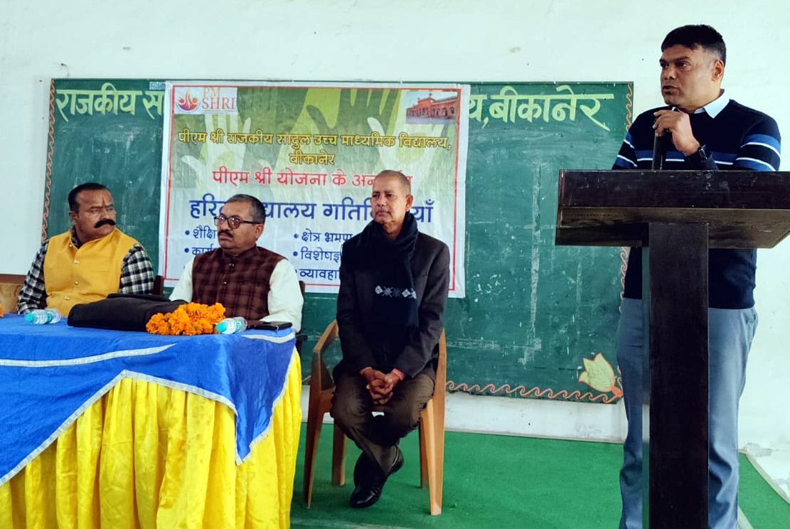बीकानेर। पीएम श्री राजकीय उच्च माध्यमिक विद्यालय सादुल बीकानेर के डॉ. कलाम सभागार में शनिवार को हरित विद्यालय गतिविधियों के अंतर्गत विशेषज्ञ वार्ता का आयोजन किया गया। इसके अंतर्गत शिक्षाविद एवम प्रधानाचार्य गोमाराम जीनगर के द्वारा भारतीय जीवन शैली और परम्पराओं में पर्यावरण संरक्षण विषय पर व्याख्यान प्रस्तुत किया गया। व्याख्यान देते हुए गोमाराम नें कहा कि घर परिवार में पेड़ पौधों और पर्यावरण की समझ विकसित करनी आवश्यक है। अगर हम नहीं संभले तो मानवता संकट में आ सकती है। हमारी पारंपरिक जीवन शैली तुलसी-पीपल-आंवला आदि के माध्यम से हर घर-मोहल्ले में पर्यावरण संरक्षण करना सिखाती है। भारतीय परम्पराओं में चींटी से लेकर चिड़िया तक सभी के लिए भोजन-जीवन का अस्तित्व है क्योंकि पर्यावरण का अस्तित्व सभी जीवों के सामूहिक अस्तित्व से जुड़ा हुआ है। उन्होने कहा कि परिवार और कुटुंब को आपसी चर्चा और चिंतन करके नियमित रूप से पर्यावरण और सामाजिक विकास के लिए सामूहिक ऊर्जा का उपयोग करना चाहिए। मुख्य अतिथि राजकीय अभियांत्रिकी महाविद्यालय बीकानेर के सहायक कुलसचिव राजेश कुमार व्यास थे। व्यास नें युवाओं द्वारा राष्ट्र और समाज के लिए अपने योगदान को पर्यावरण और नैतिकता के लिए संजोने का आह्वान किया। उन्होने कहा कि विद्यालय के विद्यार्थी ही देश का आने वाला भविष्य है, अगर आज विद्यार्थी समाज और पर्यावरण के उत्थान के लिए संकल्पित होते हैं तो ये देश के लिए गौरवमय होगा। प्रधानाचार्य यशपाल पंवार ने कहा कि पीएम श्री विद्यालय की गतिविधियां अन्य विद्यालयों के लिए लाइट हाउस का कार्य कर रही हैं। कार्यक्रम में विद्यालय के शिक्षक, अभिभावक और विद्यार्थी उपस्थित रहे। वार्ता कार्यक्रम के प्रभारी पवन कुमार मित्तल नें सभी का आभार ज्ञापन किया। कार्यक्रम का संचालन सुभाष जोशी के द्वारा किया गया।