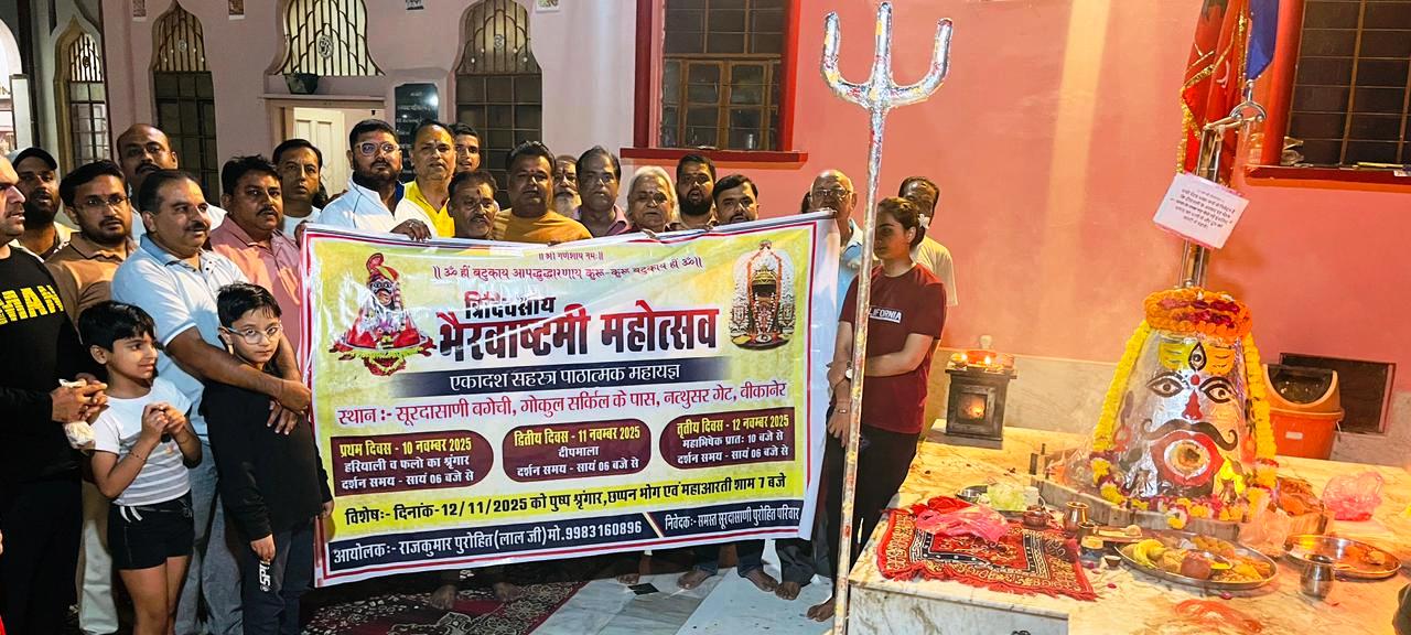 बीकानेर। काल भैरवाष्टमी महोत्सव का आयोजन सूरदासाणी पंचायत बगेची में 12 नवम्बर रात्रि में संपन्न होगा। कोडाणा सियाणा मंदिर के पूजारी पं. अमित पुरोहित ने बताया कि भैरवाष्टमी के अवसर पर भैरू जी के मंदिर को रंग-बिरंगी रोशनी, फूल-मालाओं एवं विशेष श्रृंगार से सजाया जाएगा। कार्यक्रम के संस्थापक राजकुमार पुरोहित (लाल जी) ने बताया कि प्रतिवर्ष की भांति इस बार भी त्रिदिवसीय भैरवाष्टमी महोत्सव का आयोजन 10 से 12 नवम्बर तक किया जाएगा। पहले दिन 10 नवम्बर को हरियाली एवं फलों का श्रृंगार होगा, दूसरे दिन 11 नवम्बर को दीपमाला का आयोजन होगा, जबकि तीसरे दिन 12 नवम्बर को पंचगव्य से महाभिषेक, विशेष श्रृंगार, छप्पन भोग एवं महाआरती संपन्न की जाएगी। इस अवसर पर वैदिक मंत्रोच्चार के साथ पूजा-अर्चना की जाएगी। कार्यक्रम के अध्यक्ष शंकर पुरोहित ने बताया कि तीनों दिनों में भैरव जी के पाठ, श्रृंगार एवं दीपमाला के आयोजन होंगे। मीडिया प्रभारी अजय कुमार पुरोहित ने बताया कि काल भैरवाष्टमी महोत्सव की तैयारियाँ जोरों पर हैं।