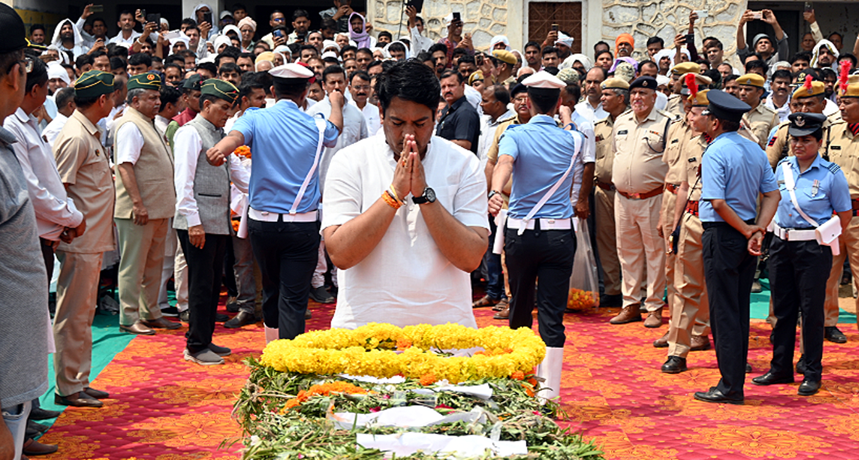 बीकानेर। ऑपरेशन सिंदूर के तहत उधमपुर में वीरगति को प्राप्त हुए सार्जेंट सुरेंद्र कुमार का रविवार को झुंझुनू जिले में उनके गांव मेहरादासी (मंडावा), झुंझुनूं में पूर्ण राजकीय सम्मान से अंतिम संस्कार किया गया। झुंझुनूं जिले के प्रभारी मंत्री श्री अविनाश गहलोत ने प्रदेश के मुख्यमंत्री श्री भजनलाल शर्मा की ओर से शहीद के परिजनों को ढाढ़स बंधाया और पुष्पचक्र अर्पित करते हुए संवेदना व्यक्त की। शहीद श्री सुरेंद्र कुमार को उप मुख्यमंत्री डॉ. प्रेमचंद बैरवा सैनिक कल्याण एवं युवा और खेल मंत्री कर्नल राज्यवर्धन सिंह राठौड़, नगरीय विकास राज्यमंत्री (स्वतंत्र प्रभार) श्री झाबर सिंह खर्रा, राज्यसभा सांसद श्री मदन राठौड़, नेता प्रतिपक्ष श्री टीकाराम जूली, पूर्व नेता प्रतिपक्ष श्री राजेंद्र राठौड़, सांसद श्री बृजेंद्र ओला, झुंझुनूं विधायक श्री राजेंद्र भांबू, नवलगढ़ विधायक श्री विक्रम सिंह जाखल, खेतड़ी विधायक श्री धर्मपाल गुर्जर, मंडावा विधायक रीटा चौधरी, उदयपुरवाटी विधायक श्री भगवानाराम सैनी, लक्ष्मणगढ़ विधायक श्री गोविंद डोटासरा, फतेहपुर विधायक श्री हाकम अली, चौमूं विधायक शिखा मील बराला, श्री मुकेश दाधीच, जिला कलक्टर श्री रामावतार मीणा, एसपी श्री शरद चौधरी, जिला प्रमुख हर्षिनी कुलहरी, श्री बनवारी लाल सैनी, नवलगढ़ प्रधान श्री दिनेश सुंडा, पूर्व सांसद श्री नरेंद्र कुमार, पूर्व सांसद संतोष अहलावत, पूर्व विधायक श्री सुभाष पूनियां, पूर्व विधायक श्री शुभकरण चौधरी समेत पूर्व सैनिकगणों, जनप्रतिनिधियों व गणमान्यजनों ने पुष्पचक्र अर्पित किए।