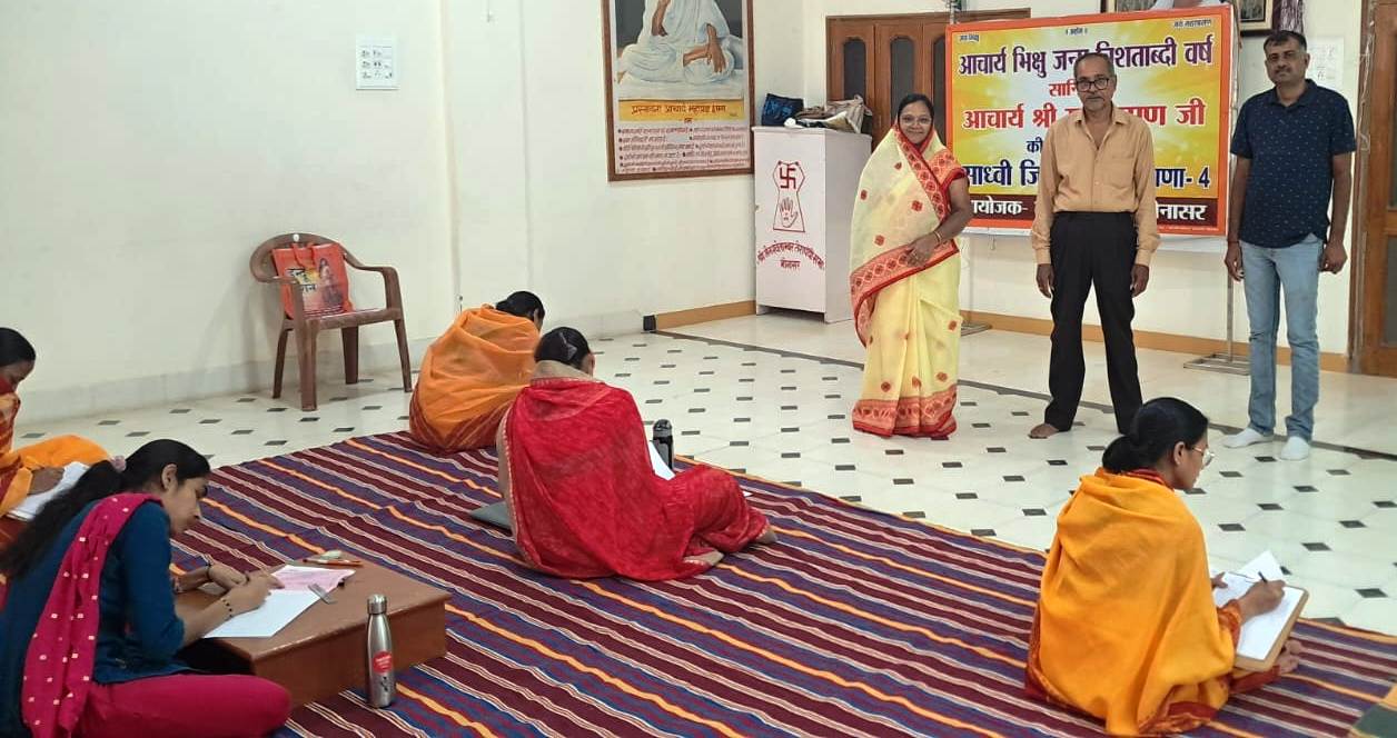 बीकानेर। जैन श्वेतांबर तेरापंथी महासभा के अंतर्गत संचालित ज्ञानशाला प्रकोष्ठ के तत्वावधान में संपूर्ण देश में ज्ञानशाला प्रशिक्षक परीक्षा का आयोजन हुआ। जिनबालाजी के सान्निध्य में तेरापंथ भवन में हुआ। परीक्षा से पूर्व साध्वी श्री जी द्वारा मंगल पाठ सुनाया गया। साध्वीश्रीजी के सान्निध्य में केंद्र से प्राप्त प्रश्न-पत्र का लिफाफा खोला गया। इस अवसर पर राजस्थान थली अंचल के आंचलिक सहसंयोजक रतनलाल छलाणी क्षेत्रीय संयोजिका शांता भूरा, तेरापंथी सभा भीनासर अध्यक्ष विशाल सेठिया, परीक्षा केंद्र व्यवस्थापक सुरेंद्र सेठिया की उपस्थिति रही। प्रशिक्षिका परीक्षा में विज्ञ श्रेणी में 6 प्रशिक्षिकाओं, विशारद व स्नातक श्रेणी में एक-एक प्रशिक्षिका ने सहभागिता की। इस तरह से कुल 8 प्रशिक्षिकाओं की उपस्थिति रही।