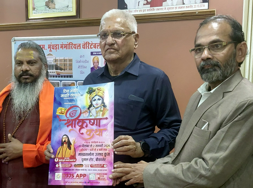 बीकानेर। बीकानेर में दिव्य ज्योति जागृति संस्थान द्वारा 27 दिसम्बर से 2 जनवरी तक श्रीकृष्ण कथा का आयोजन पूगल रोड़ स्थित माखन भोग में किया जायेगा। स्वामी प्रेमप्रकाशा नंद महाराज द्वारा बताया गया कि इस भक्तिमयी कृष्ण कथा के पोस्टर का विमोचन बीकानेर जिला उद्योग संघ के अध्यक्ष एवं समाजसेवी श्यामसुंदर सोनी तनिष्क से करवाया गया। कथा का वाचन साध्वी सुश्री जयंती भारती के श्रीमुख से होगा। इस मौके पर महेंद्र शर्मा व अंकित पारीक आदि उपस्थित थे।