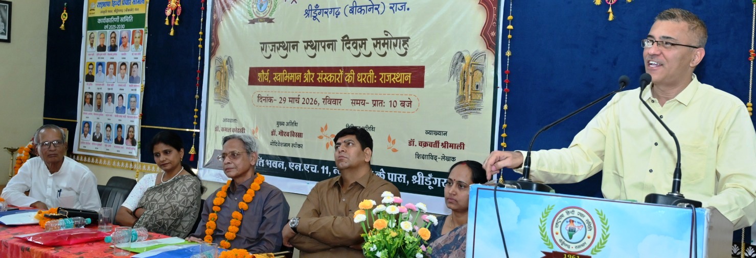 बीकानेर। राष्ट्रभाषा हिंदी प्रचार समिति के संस्कृति भवन में ’शौर्य, स्वाभिमान और संस्कारों की धरती राजस्थान’ विषय पर संगोष्ठी का आयोजन किया गया। इस अवसर पर उपस्थित संभागियों को अपने व्याख्यान से जोड़ते हुए डॉ. चक्रवर्ती श्रीमाली ने वेद परम्परा, लुप्त नदी सरस्वती का स्मरण करते हुए राजस्थान की धरा पर अवतरित पन्नाधाय, मीरा, महाराणा प्रताप व बीकानेर के शासक कर्णसिंह को राजस्थान विकास के विभिन्न उपक्रमों में याद किया। मुख्य अतिथि शिक्षाविद् मोटिवेशनल स्पीकर डॉ. गौरव बिस्सा ने वीर प्रसूता धरा राजस्थान की गौरवमयी परम्परा को तथ्यों और तर्कों के साथ प्रस्तुत किया। बिस्सा ने कहा तेरह वर्षीय बालिका काली बाई, मां अमृता व सहल कंवर का बलिदान विश्व में एकमात्र उदाहरण में गिना जाता है। ठीक इसी प्रकार गोविन्द गिरी के नेतृत्व में आयोजित सम्प सभा के दौरान हुए बलिदान कोई सानी नहीं। अपने उद्बोधन में डॉ. बिस्सा नेविचार, विश्वास व विवेक की त्रिवेणी राजस्थान को अनेक ऐतिहासिक प्रसंगों के माध्यम से व्याख्यायित किया। विशिष्ट अतिथि शिक्षाविद् पुष्पा शर्मा ने वीर दुर्गादास, रानी पद्मिनी का उदाहरण देते हुए लोक कला व संस्कृति पर अपने विचार रखे। संस्थाध्यक्ष श्याम महर्षि ने राजस्थान के लोक व परम्परा की समृद्धि के साथ ऐतिहासिक व मिथकीय साहित्य के सन्दर्भों को प्रस्तुत किया।समारोह में डॉ. मदन सैनी, सत्यनारायण योगी, भंवर भोजक, सत्यदीप, श्रीभगवान सैनी, अनिल सोनी, रामचन्द्र राठी, राजेश सारस्वत, सुनील खांडल, नारायण शर्मा, विजय महर्षि, मुकेश सैनी, बालकिशन, राजीव श्रीवास्तव, बजरंग शर्मा, शुभकरण पारीक, सत्यनारायण स्वामी, रमाकांत झंवर, डॉ. मनीष सैनी, राजू शर्मा, महावीर सारस्वत सहित अनेक विद्वानों, और साहित्यकारों के साथ आम जन ने सहभागिता निभाई।