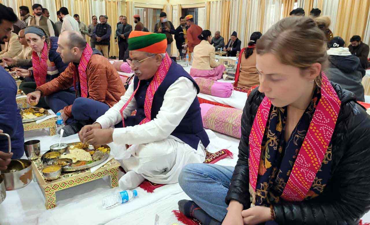 बीकानेर। अंतर्राष्ट्रीय ऊंट उत्सव के पहले दिन देशी और विदेशी पावणो ने पहली बार जाजम पर बैठकर राजस्थानी देशी भोजन का स्वाद चखा। जिला प्रशासन तथा पर्यटन विभाग के तत्वावधान् में बीकानेर जिला उद्योग संघ द्वारा रानी बाजार औद्योगिक क्षेत्र स्थित संघ परिसर में लोक कला एवं संस्कृति लोक उद्यम और व्यंजनों की त्रिवेणी देखने को मिली। केन्द्रीय कानून मंत्री अर्जुन राम मेघवाल ने विदेशी पावणो की अगवानी की तथा उनके साथ जाजम पर बैठकर बाजरे की रोटी-राबड़ी-खीचड़ा-सांगरी की सब्जी और पापड़.फली सहित परम्परागत भोजन का लुत्फ उठाया। विदेशी मेहमानों के लिए यह नया अनुभव था। ठेठ राजस्थानी अंदाज में मनुहार की परम्परा के साथ पहली बार आयोजित मान मनुहार कार्यक्रम में शहर के संभ्रात नागरिकों ने शिरकत की। इस दौरान जिला उद्योग संघ परिसर में गोबर से बने उत्पादों, ऊन से बने गलीचों, शॉल एवं अन्य उत्पादों बड़ी पापड़ तथा हस्तनिर्मित उत्पादों की स्टॉल्स आकर्षण का केन्द्र रहे।