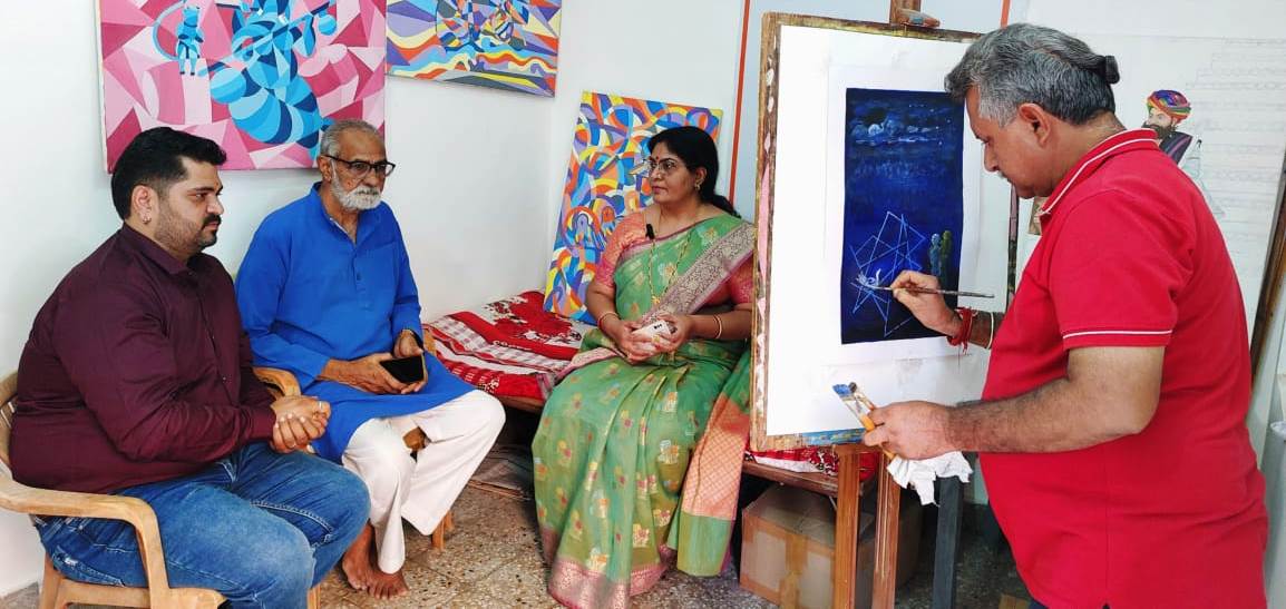 बीकानेर। शब्द मय रंग संस्थान में कला श्रृंखला-7 मे कविता पर चित्रण करते हुवे चित्रकार धर्मा स्वामी द्वारा कवियत्री मनीषा आर्य सोनी की कविता जीवन अंधियारे नभ पर आये रात सुहानी पर आधारित एक चित्र बनाया है। इस चित्र में एक्रेलिक रंगों का प्रयोग किया गया है। चित्र मे आकाश मय वातावरण को समीपवरती कूल कलर का प्रयोग करते हुवे ज्यामितक आकारों से संयोजन किया गया। कवियत्री मनीषा आर्य सोनी ने कहा की कविता पर लाइव पेंटिंग बनते हुवे देखने का यह पहला अवसर रहा जिसमें शब्दो के साथ किये रंगों का नया प्रयोग किया गया है। संस्थान के राम कुमार भादाणी ने बताया कि यह कला श्रृंखला-7 में कला और साहित्य के प्रेमियों के लिए एक बड़ा अवसर है। धर्मा स्वामी के चित्रों में कविता की भावनाओं और विचारों को बखूबी उकेरा गया है। जो कविता की गहराइयों को बढ़ावा देते हैं। संस्थान की इस कार्यक्रम का निर्देशन बीकानेर के वरिष्ठ चित्रकार हरिगोपाल सन्नू हर्ष के निर्देशन मे किया गया। इस पहल से कला और साहित्य के क्षेत्र में एक नए आयाम की शुरुआत हुई है। यह कविता और चित्रकला के अद्भुत मेल का अनुभव कराती है। कार्यक्रम मे आये हुवे अतिथियों का गणेश रंगा द्वारा धन्यवाद ज्ञापित करते हुवे कला साहित्यिक एक अनूठा प्रयास बताया जो कि एक नया आयाम के रूप मे है।